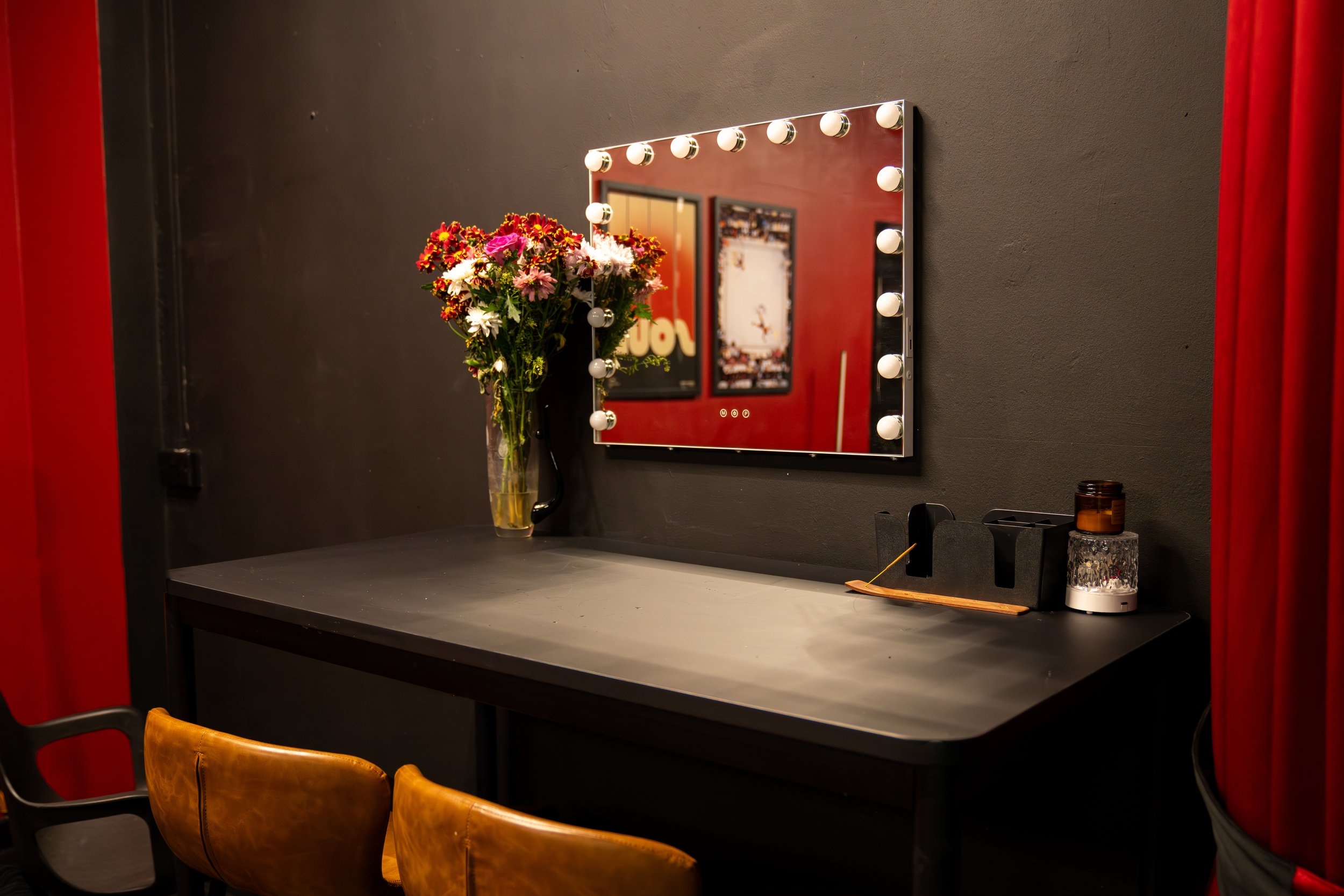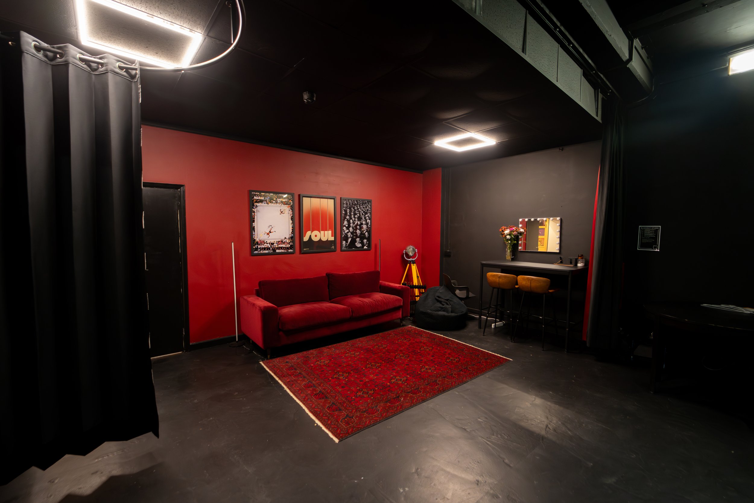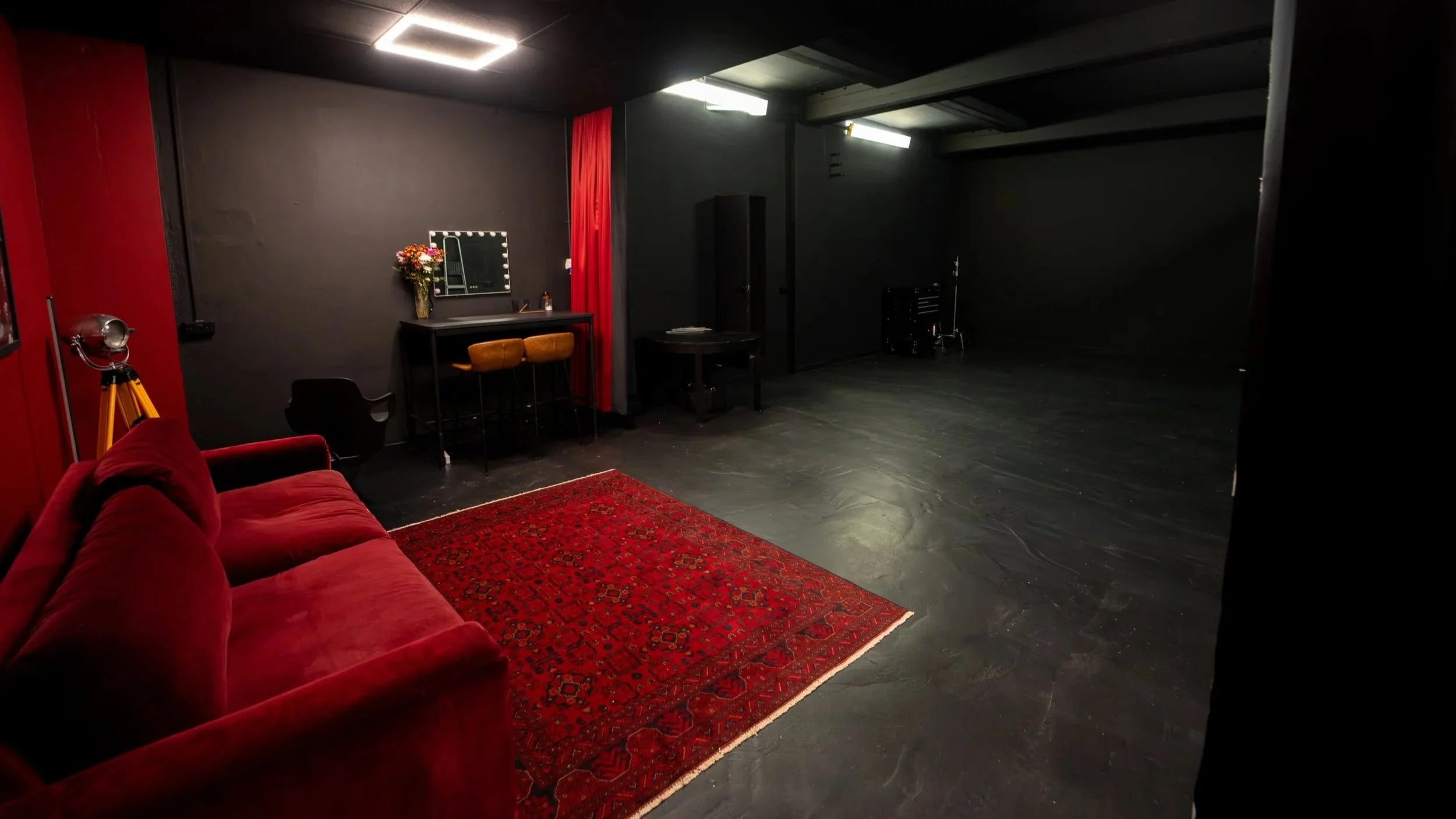 The Blackout Studio is a controlled dark space designed for cinematic lighting, video, and high-impact creative work. With a 26 ft × 19 ft shooting area, 12 ft ceilings, matte black walls, blackout conditions, a bold red feature wall, and double-sided curtains for flexible setups, it offers complete control over light and atmosphere. A lounge area, vanity, and changing room to ensure comfort for talent and clients. When enquiring, please share detailed information about your project and any production or equipment needs so we can tailor availability and pricing. View our rate cards for studio hire and services here.