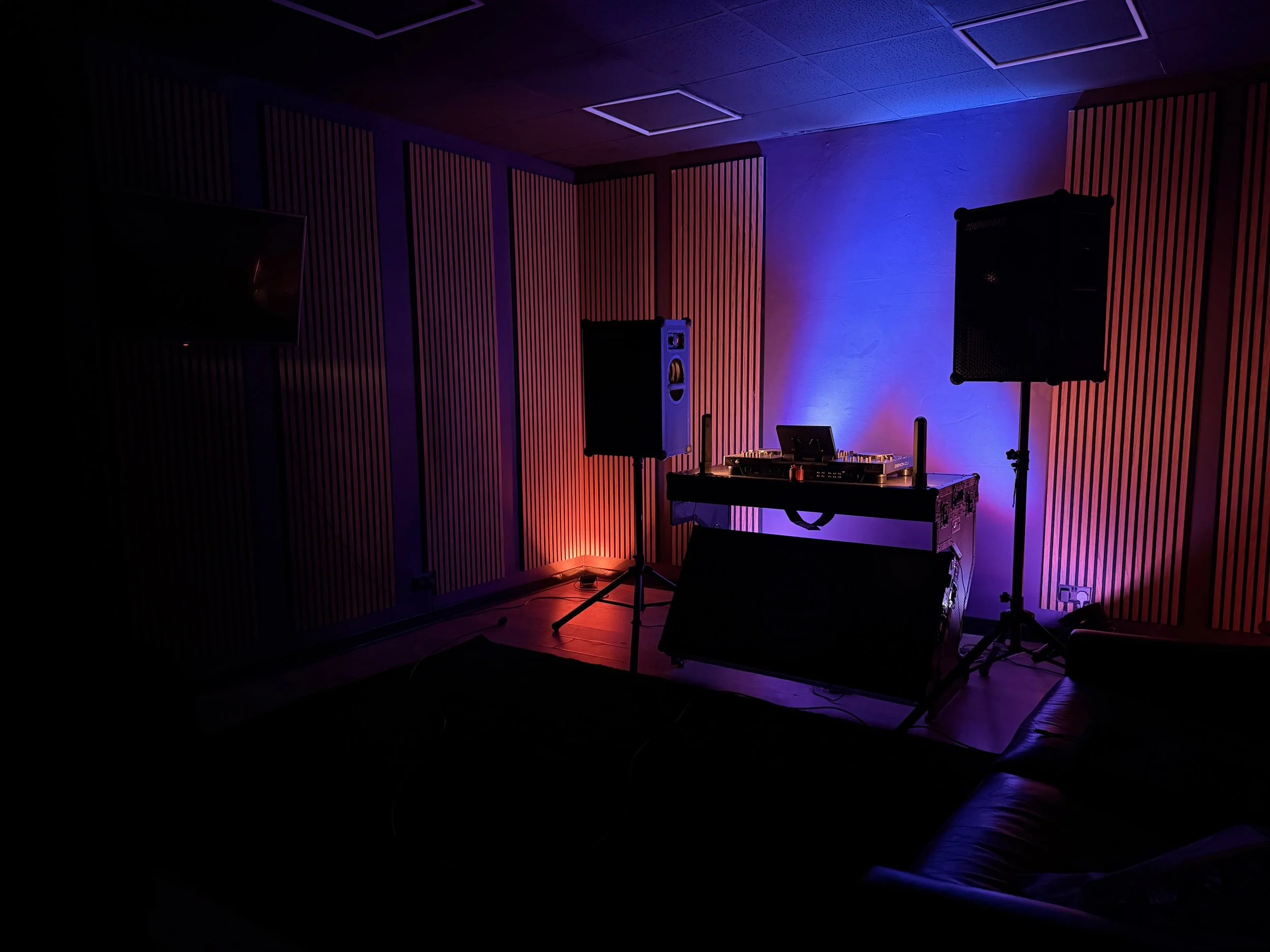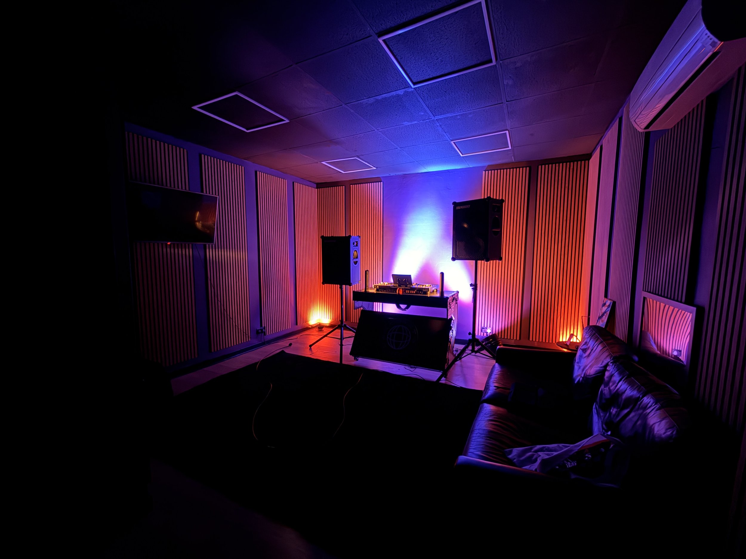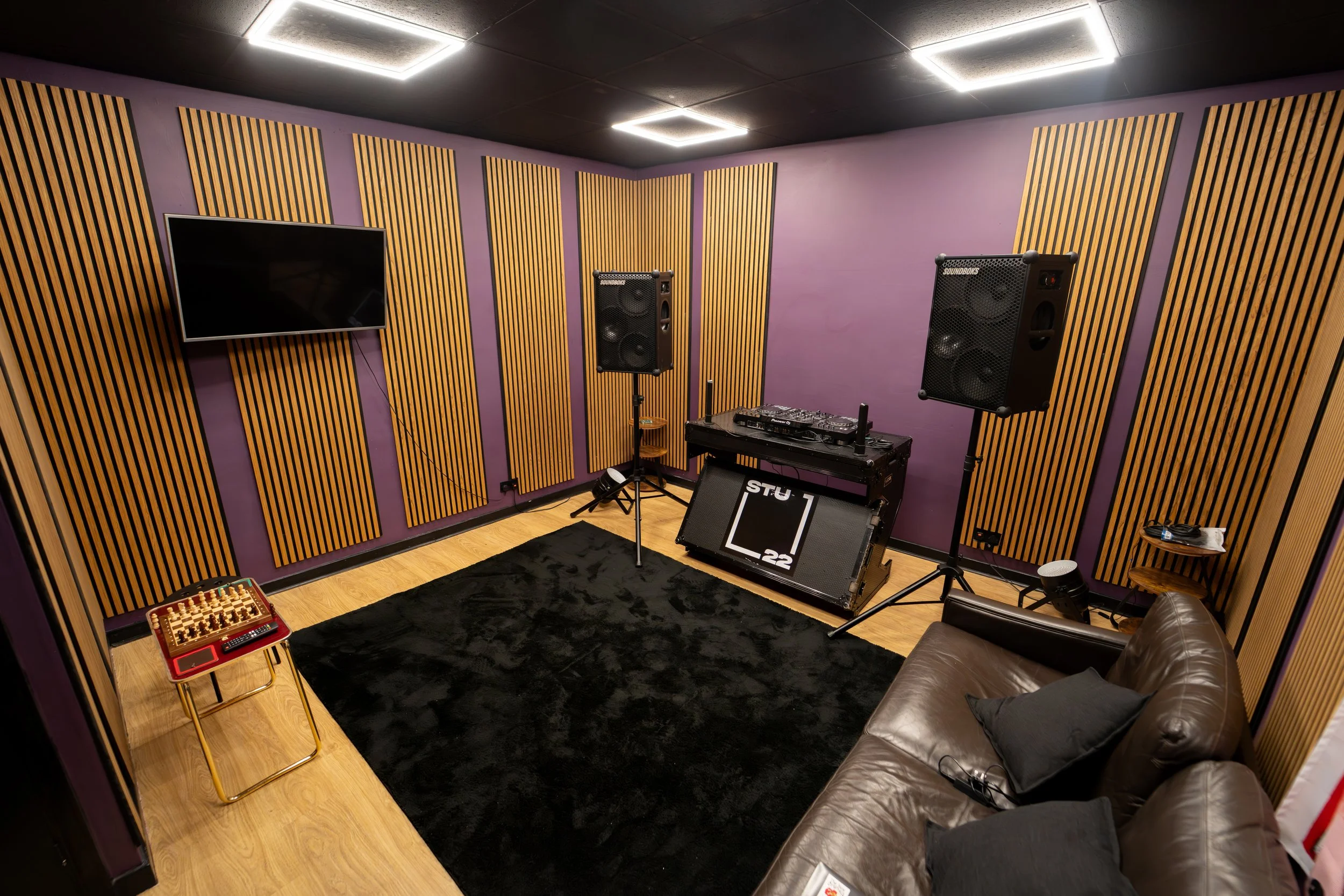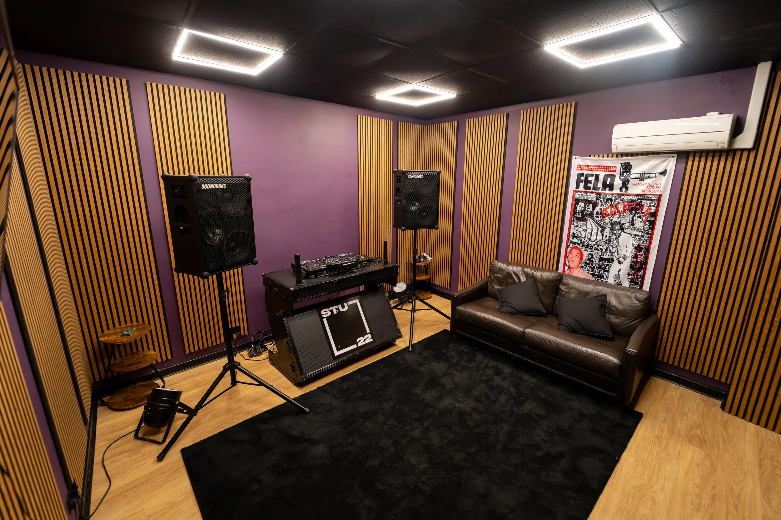 The DJ Studio is a fully sound-treated, private space designed for rehearsing, scratching, livestreaming, filming content, podcasting, and spoken-word recording without interruption. Built for deep focus and true sound isolation, it can be booked solo, paired with the Blackout Studio for video shoots, or hired hourly for complete privacy. When enquiring, please share details about your session and any production or equipment needs so we can tailor availability and pricing. View our rate cards for studio hire and services here.