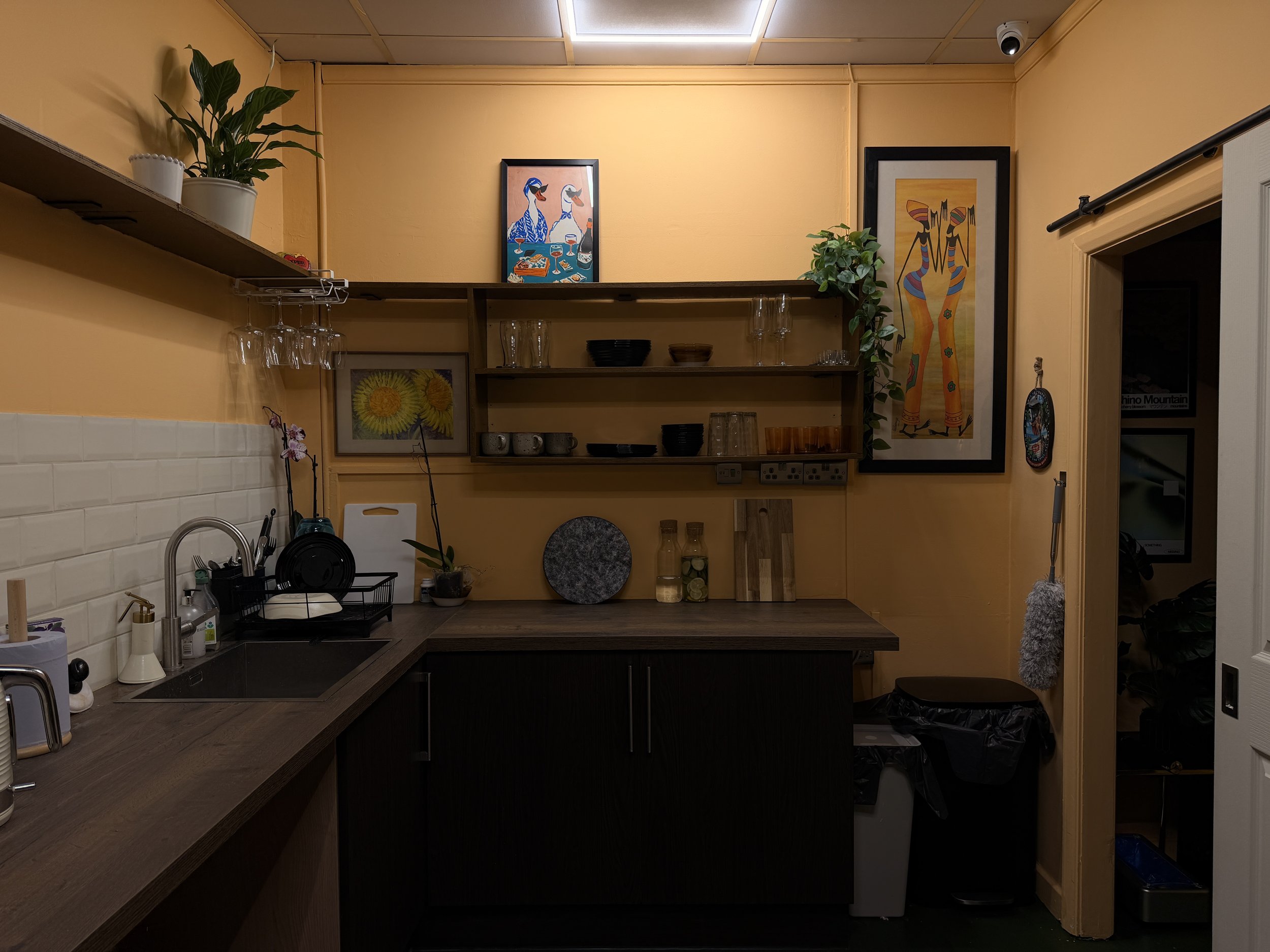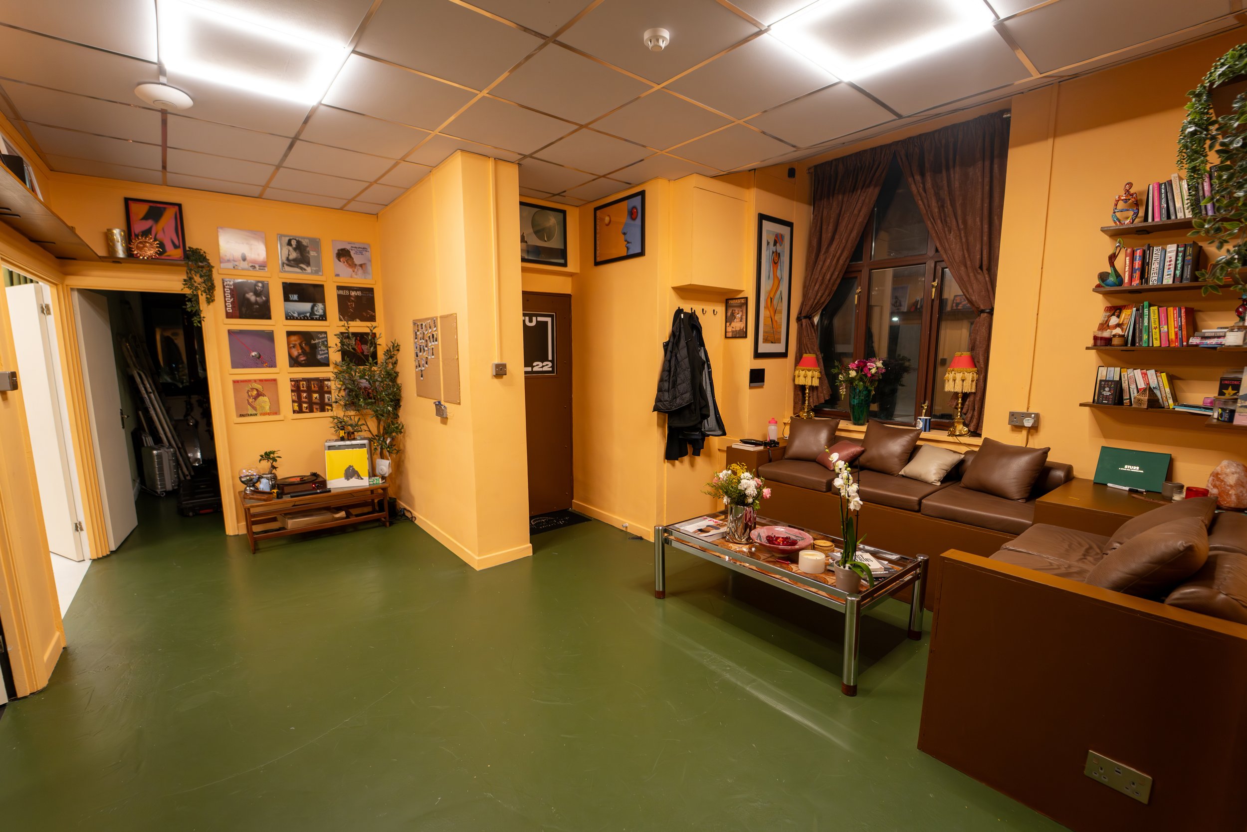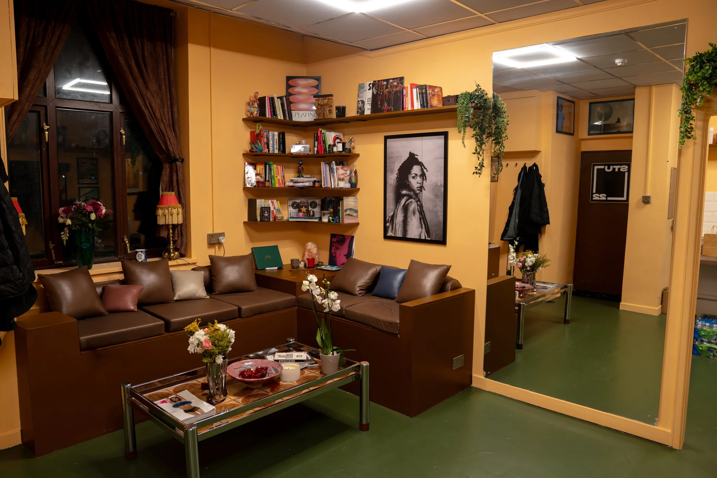 Our Interim area is designed to feel warm, welcoming, and creatively inspiring. With peach tones, rich brown textures, and shelves filled with books and vinyl, the space reflects the personality of Stu 22 — thoughtful, expressive, and community-led.